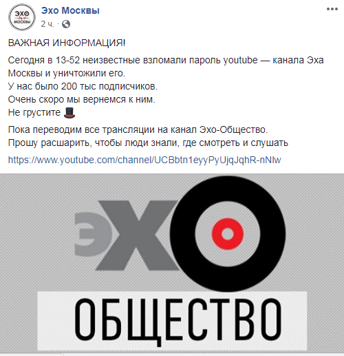 Неизвестные взломали YouТube радио "Эхо Москвы" и уничтожили канал радиостанции