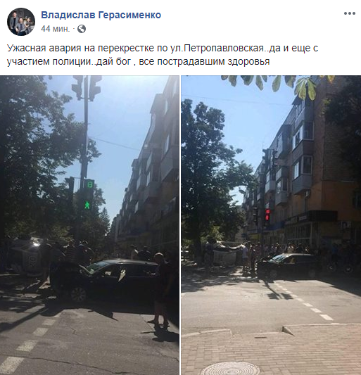 Автомобиль патрульной полиции столкнулся с Аudi на перекрестке улиц Петропавловская и Перекопская. Служебное авто после столкновения перевернулось на крышу.