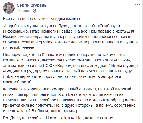 Как сообщил в Facebook директор информационно-консалтинговой компании Defense Express Сергей Згурец, по Крещатику в 2018 году проедутся оперативно-тактический комплекс "Сапсан", высокоточная система залпового огня "Ольха", автоматизированная РСЗО "Верба", новая самоходная 155-мм гаубица "Богдана" и ряд других новинок.