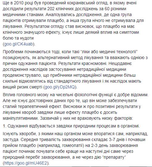 По данным Супрун, еще в 2010 году были проведены исследования, результатом которых стал вывод, что плацебо не имеет значимого клинического эффекта, существует лишь некоторое влияние на симптомы боли и тошноты.