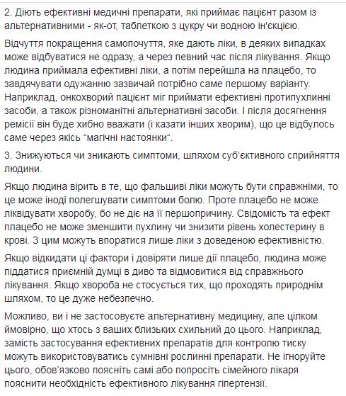 "Если исключить эти факторы и доверять только действию плацебо, человек может поддаться приятной мысли в чудо и отказаться от истинного лечения. Если болезнь не касается тех, что проходят естественным путем, то это очень опасно", - отмечает Супрун.