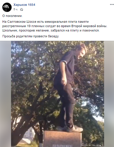"На Салтовском Шоссе есть мемориальная плита памяти расстрелянным 19 пленным солдатам во время Второй мировой войны. Школьник, проспорив желание, забрался на плиту и помочился", - говорится в сообщении в соцсети.