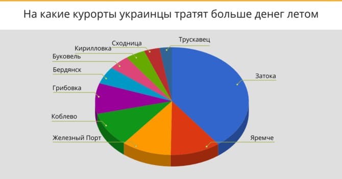 В результате, в лучшей десятке курортов Украины места распределились следующим образом: 6 мест заняли морские направления (заняли 60% ТОПа) , 2 места - карпатские (заняли 20% ТОПа) и 2 места - оздоровительные курорты (заняли 20% ТОПа).