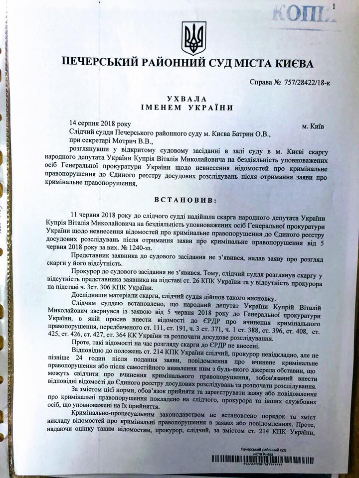 Куприй также приложил сканы соответствующего определения суда.