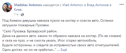 "Село Пуховка. Броварской район. Дама на данном авто, каким-то образом наехала на костер. (По ее словам) и села на пузо, и не смогла уехать. Итог сгорел автомобиль. Будьте осторожны, и следите за исправностью своих авто огнетушителей. Один достал, но он не сработал..." - говорится в сообщении.