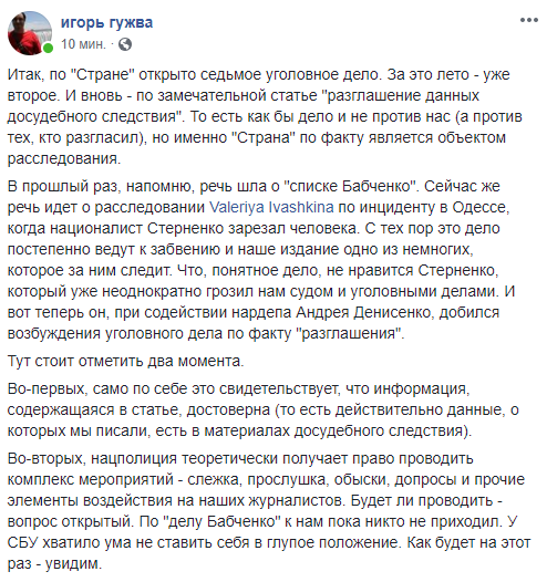 "Итак, по "Стране" открыто седьмое уголовное дело. За это лето - уже второе. И вновь - по замечательной статье "разглашение данных досудебного следствия". То есть как бы дело и не против нас (а против тех, кто разгласил), но именно "Страна" по факту является объектом расследования", написал главред "Страны" Игорь Гужва у себя в Facebook.