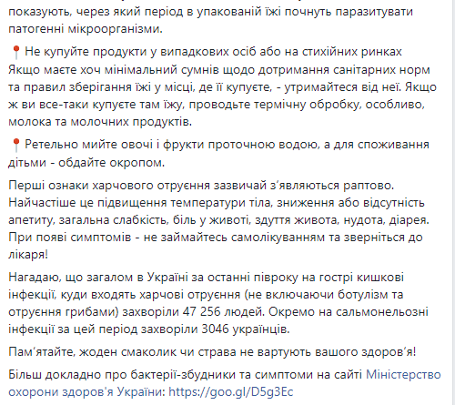 Она напомнила, что всего в Украине за последние полгода острыми кишечными инфекциями, куда входят пищевые отравления (не включая ботулизм и отравление грибами) заболели 47 256 человек. Отдельно сальмонеллезными инфекциями за этот период заболели 3046 украинцев.