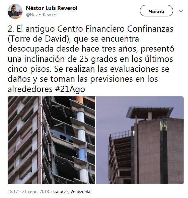 Однако в столице страны, Каракасе, недостроенный небоскреб, высотой 190 метров заметно накренился после землетрясения. Об этом сообщил в Twitter министр внутренних дел, юстиции и по вопросам мира Нестор Ревероль.
