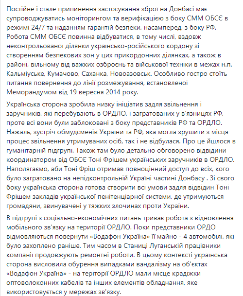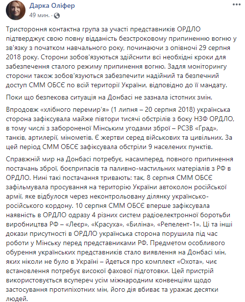 "Трехсторонняя контактная группа при участием представителей отдельных районов Донецкой и Луганской областей подтверждает свою полную приверженность бессрочному прекращению огня в связи с началом учебного года, начиная с полуночи 29 августа 2018 года. Стороны обязуются реализовать все необходимые шаги для обеспечения устойчивого режима прекращения огня", – написала она. По словам Олифер, стороны договорились обеспечивать полный доступ наблюдателям специальной мониторинговой миссии ОБСЕ в соответствии с ее мандатом.