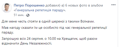Вместе с этим постом прикреплены общие фотографии Порошенко с участниками парада войск ко Дню Независимости Украины во время генеральной репетиции.