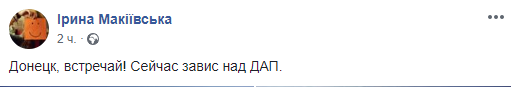 "Донецк, встречай! Сейчас завис над ДАП", - написала она, опубликовав фото с момента запуска.