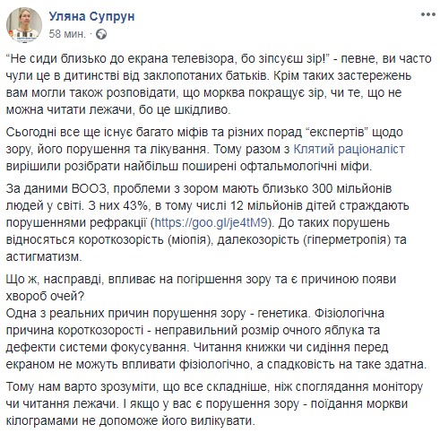 Глава Минздрава Ульяна Супрун традиционно, в Facebook решила развеять очередные "мифы". На этот раз в ее поле зрения оказались глаза, их лечение и профилактика заболеваний.