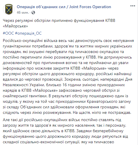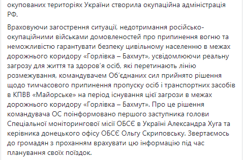"Учитывая обострение ситуации, несоблюдение российско-оккупационными войсками договоренностей о прекращении огня и невозможностью обеспечить безопасность гражданскому населению в пределах дорожного коридора "Горловка – Бахмут", осознавая реальную угрозу для жизни и здоровья лиц, пересекающих линию разграничения, командующим Объединенных сил принято решение о временном прекращении пропуска лиц и транспортных средств через КПВВ "Майорское" на период существования этой угрозы в пределах дорожного коридора "Горловка – Бахмут. … Обращаемся к гражданам с просьбой учесть эту информацию при планировании своих поездок", – говорится в сообщении на странице штаба ООС в Facebook в четверг вечером.