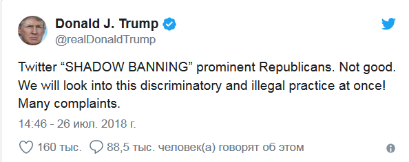 Напомним, что президент США в своем Twitter заявил о "теневом бане" соцсетей. По его мнению Twitter блокирует аккаунты членов республиканской партии.