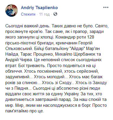Цаплиенко отмечает, что погибшие айдаровцы из разных областей Украины. "Кто-то с Востока... Кто-то с Запада или с Юга", - отмечает он.