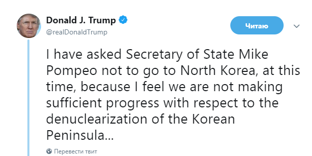 "Я попросил государственного секретаря Майка Помпео не ехать в Северную Корею, поскольку, я чувствую, что мы не делаем достаточных успехов в денуклеризации Корейского полуострова", - сказано в сообщении.