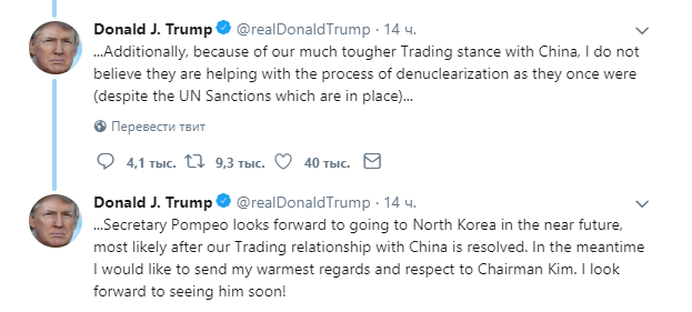 Трамп добавил, что Помпео отправится в КНДР после того, как торговые отношения между США и Китаем будут решены.  При этом он надеется на скорую встречу с главой Северной Корери Ким Чен Ыном. "Тем временем я хотел бы отправить теплые слова уважения главе Киму. Я с нетерпением жду встречи с ним в ближайшее время", - написал Трамп.