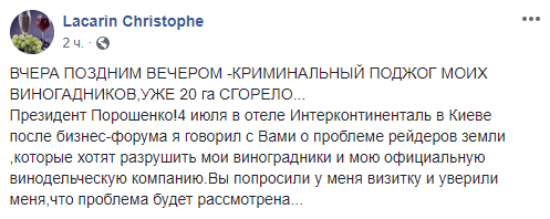 "Президент Порошенко! 4 июля в гостинице Интерконтиненталь в Киеве после бизнес-форума я говорил с вами о проблеме рейдеров земли, которые хотят разрушить мои виноградники и мою официальную винодельческую компанию. Вы попросили у меня визитку и заверили меня, что проблема будет рассмотрена", - подчеркнул Лакарен.