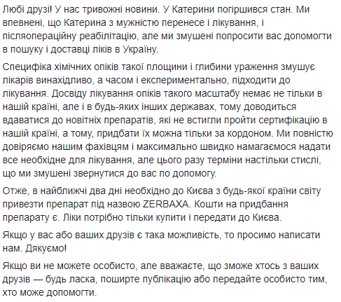 "У нас тревожные новости. У Екатерины ухудшилось состояние. Мы уверены, что Екатерина с мужеством перенесет и лечение, и послеоперационную реабилитацию, но мы вынуждены попросить вас помочь в поиске и доставке лекарств в Украине", - сказано в сообщении.