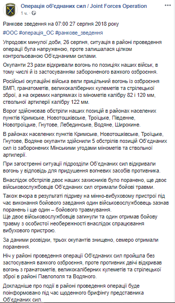 "Оккупанты 23 раза открывали огонь по позициям наших войск, в том числе и с применением запрещенного тяжелого вооружения.
