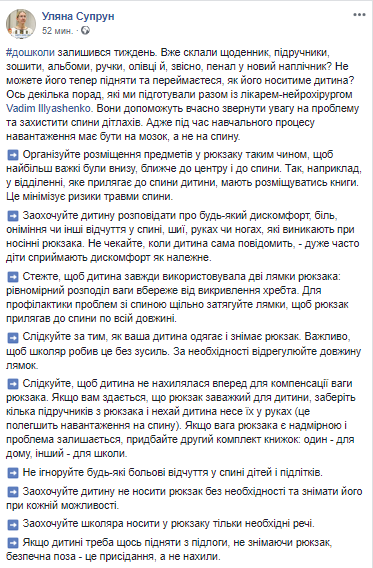 Накануне начала нового учебного года в Минздраве дали несколько советов, как защитить спины школьников от тяжелых рюкзаков. Рекомендации, разработанные вместе с врачом-нейрохирургом Вадимом Ильяшенко опубликованы на странице и.о. главы Минздрава Ульяны Супрун. По ее словам, "они помогут вовремя обратить внимание на проблему и защитить спины детей. Ведь во время учебного процесса нагрузка должна быть на мозг, а не на спину".