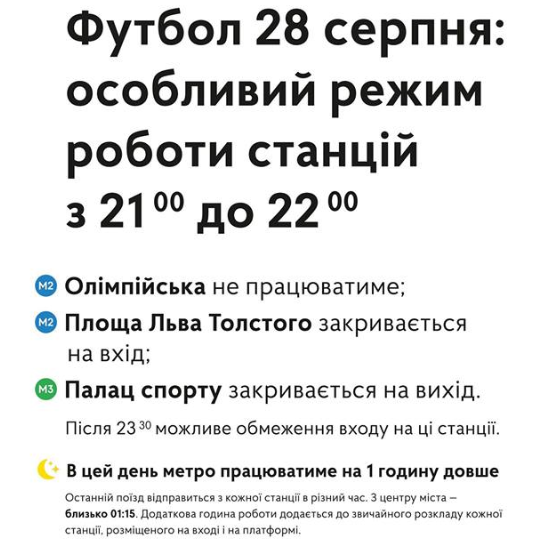 20:50 Сегодня в Киеве из-за футбола изменит работу метро. С 21:00 до 22:00 не будет работать станция метро "Олимпийская", "Площадь Льва Толстого" закроют на вход, а "Дворец спорта" - на выход. Работу метро продлят на час, из центра города болельщикам можно будет уехать в 01:15.
