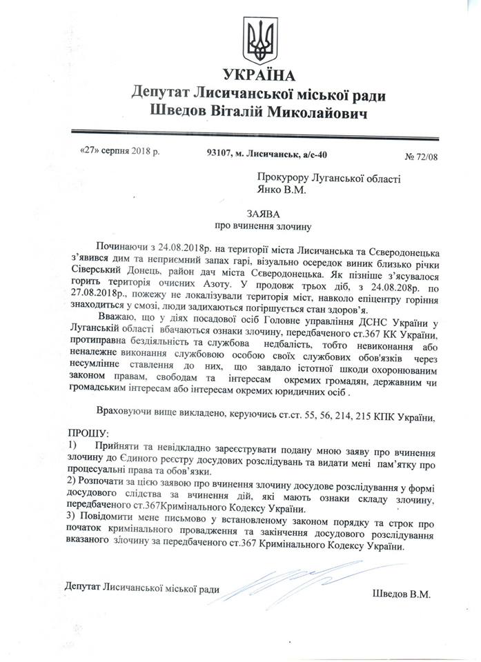 Советник главы Луганской ОГА Виталий Шведов обратился к областному прокурору с просьбой начать расследование по факту пожара. В частности - в отношении сотрудников ГосЧС.