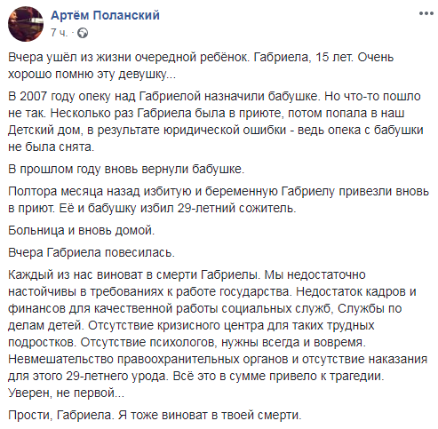 "Вчера ушел из жизни очередной ребёнок. Габриела, 15 лет. Очень хорошо помню эту девушку", – написал он в Facebook.
