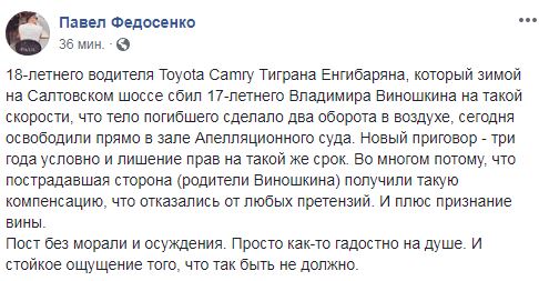 Апелляционный суд Харькова сегодня, 28 августа, приговорил к трем годам условно и к лишению прав на этот же срок водителя Toyota Camry Тиграна Енгибаряна, который зимой на Салтовском шоссе насмерть сбил 17-летнего пешехода. Об этом журналист Павел Федосенко сообщает на своей странице в Facebook.