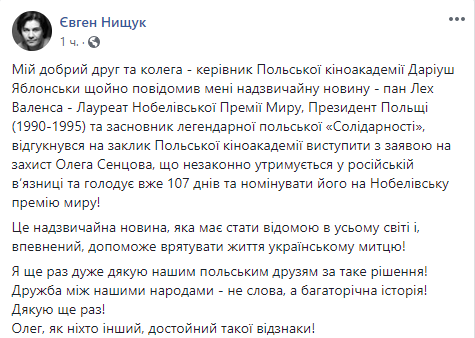 "Мой хороший друг и коллега - руководитель Польской киноакадемии Дариуш Яблонски только что сообщил мне чрезвычайную новость - господин Лех Валенса - Лауреат Нобелевской Премии Мира, Президент Польши (1990-1995 гг.) и основатель легендарной польской "Солидарности", откликнулся на призыв Польской киноакадемии выступить с заявлением в защиту Олега Сенцова, который незаконно удерживается в российской тюрьме и голодает уже 107 дней и номинировать его на Нобелевскую премию мира! Это чрезвычайная новость, которая должна стать известной во всем мире и, уверен, поможет спасти жизнь украинскому режиссеру! Я еще раз благодарю наших польских друзей за такое решение! Дружба между нашими народами - не слова, а многолетняя история! Спасибо еще раз! Олег, как никто другой, достойный такой премии!", - написал Нищук.