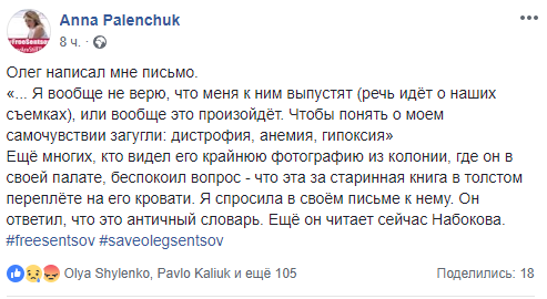 Анна Паленчук опубликовала отрывок из письма Сенцова.