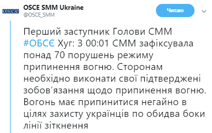 Несмотря на то, что с 29 августа, согласно договоренностям, должен вступить в силу бессрочный режим тишины на Донбассе, с начала суток Специальная мониторинговая миссия ОБСЕ (СММ) зафиксировала более 70 нарушений режима прекращения огня.