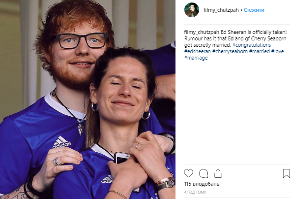 Британский исполнитель Эд Ширан в недавнем интервью признался, что тайно женился. Избранницей певца стала его бывшая одноклассница - хоккеистка Черри Сиборн. Журналист издания Access спросил Эда Ширана, стоит ли ожидать в ближайшее время свадебного торжества. В ответ певец покраснел и показал на своем пальце обручальное кольцо.
