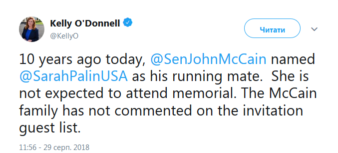 "Ровно 10 лет назад Маккейн назвал Пэйлин кандидатом на пост вице-президента. Ожидается, что она не примет участия в похоронной церемонии. Семья Маккейна не стала комментировать список гостей церемонии", - написала О'Доннелл.