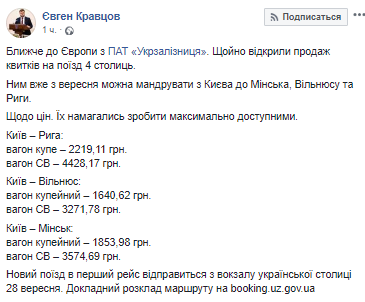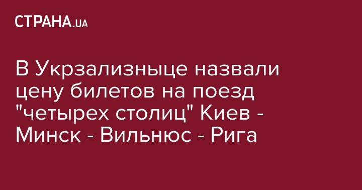 ПАО "Укрзализныця" открыла продажу билетов на поезд "четырех столиц", которым можно путешествовать из Киева в Минск, Вильнюс и Ригу. Об этом на своей странице в Facebook написал и.о. главы правления компании Евгений Кравцов, который заявил, что цены пытались сделать максимально доступными.