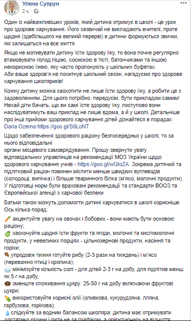 "Каждого ребенка можно привлечь не только есть здоровую пищу, а делать это с удовольствием. Для этого нужно, прежде всего, быть примером самим! Пусть дети видят, что вы сами едите здоровую пищу, постепенно они последуют вашему примеру не только дома, но и в школе", - пишет чиновница на своей странице в соцсети.
