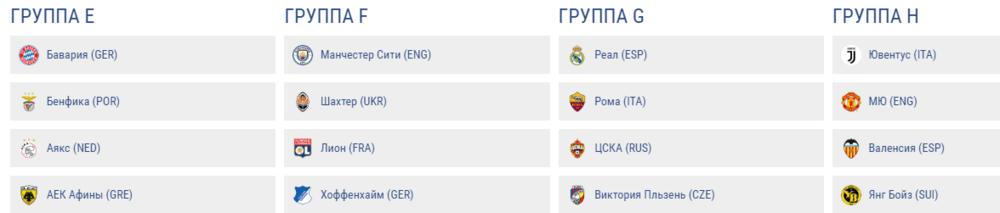 | Атлетико | Барселона | Пари Сен-Жермен | Локомотив | Бавария | Манчестер Сити | Реал | Ювентус |