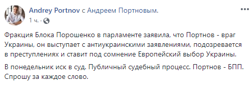"Фракция Блока Порошенко в парламенте заявила, что Портнов - враг Украины, он выступает с антиукраинскими заявлениями, подозревается в преступлениях и ставит под сомнение Европейский выбор Украины. В понедельник иск в суд. Публичный судебный процесс. Портнов - БПП. Спрошу за каждое слово", - написал он.