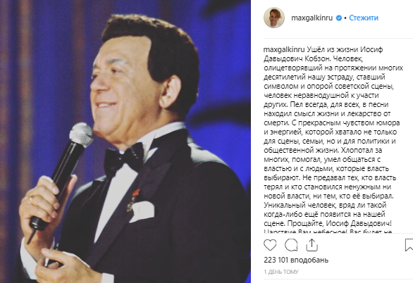 Соболезнования семье Кобзона принес и пародист Максим Галкин.