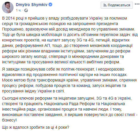 "Сегодня ключевые реформы и инициативы запущены, 3G и 4G в Украине, созданы и работают Национальный совет реформ и Национальный инвестиционный совет, организованы процессы и обучены люди. И поэтому, выполнив поставленные задачи, я решил вернуться в свою стихию – бизнес!", – заявил Шимкив.