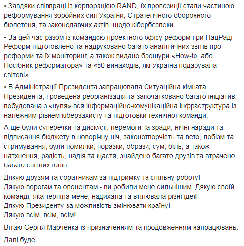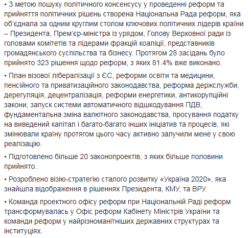 "Я всегда позиционировал себя как политик-технократ и неоднократно отказывался от продолжения политической карьеры на других должностях. Моей целью была трансформация страны, управление изменениями, содействие процессу реформ, построение процессов и команд, запуск инициатив и продвижение имиджа Украины в мире", – отметил он.
