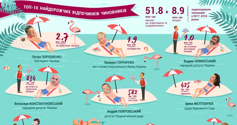 Авторы добавляют, что всего в 2017-2018 годах украинские чиновники задекларировали около 9 млн гривен расходов на отдых и еще почти 52 млн гривен отпускных им было выплачено.