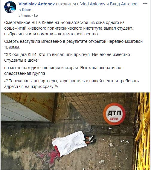 В Киеве в районе Борщаговской произошло смертельное ЧП: из окна одного из общежитий выпал молодой человек. Об этом сообщает блогер Владислав Антонов на странице в Facebook.