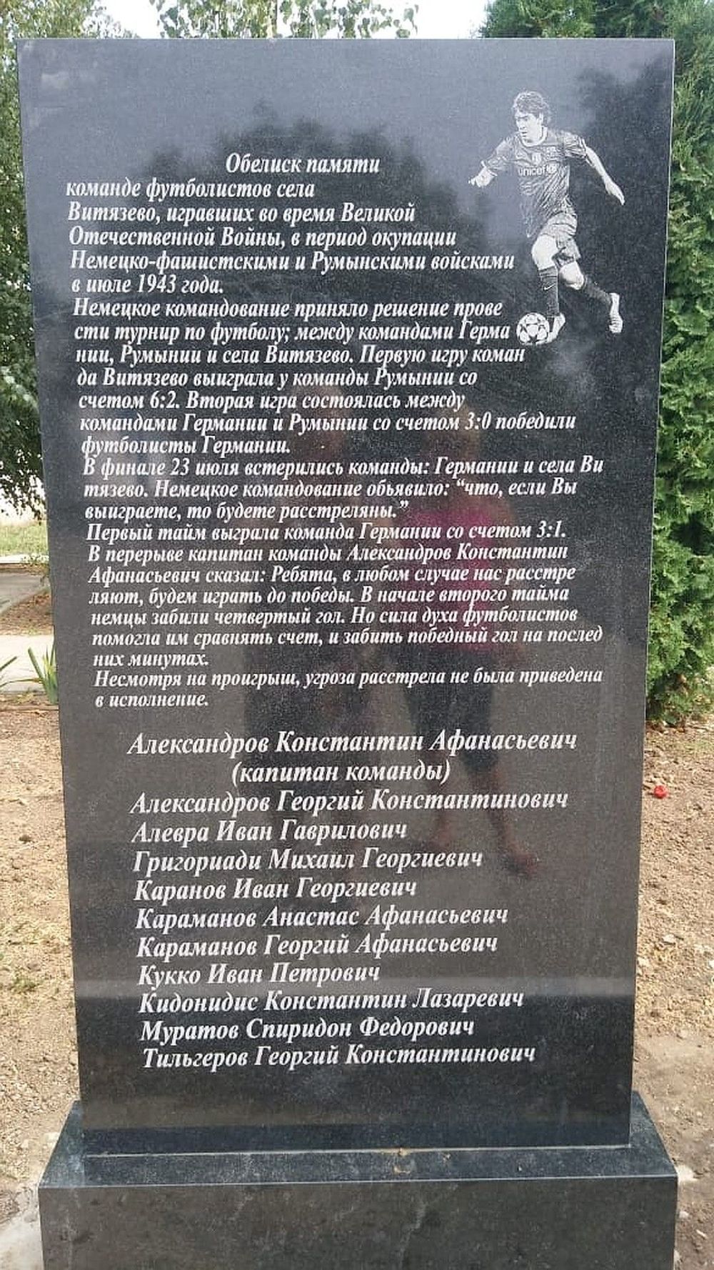 Летом 2018-го было принято решение об установке мемориала в память о подвиге футболистов. В турнире, который во время Второй мировой войны провела оккупационная власть, принимали участие три команды: сборная Германии, Румынии и Северного Кавказа (так немцы называли местных футболистов). По ходу матча советские футболисты уступали немцам со счетом 1:4, однако в итоге вырвали победу - 5:4.