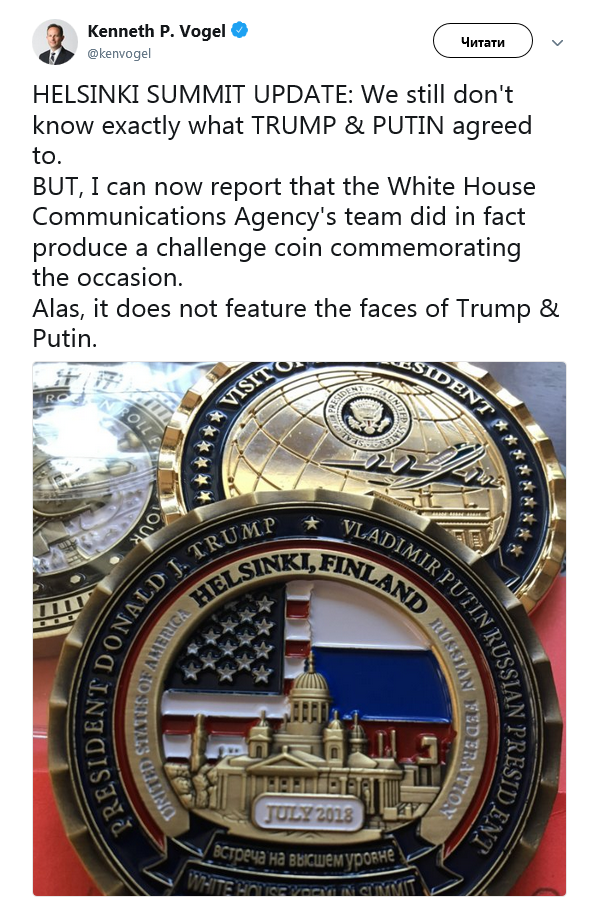 "Мы до сих пор не знаем, о чем договорились Трамп и Путин. Но теперь я могу сообщить, что команда Агентства связи Белого дома действительно создала пробную монету, посвященную этому случаю. Увы, на ней нет лиц Трампа и Путина", - написал Кеннет Фогель.