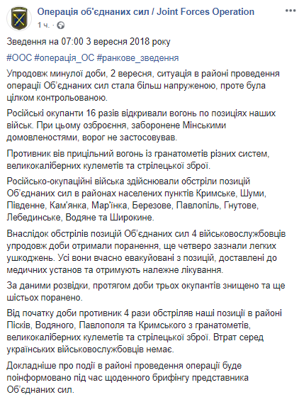 "Вследствие обстрелов позиций Объединенных сил 4 военнослужащих в течение суток получили ранения, еще четверо получили легкие повреждения. Все они вовремя эвакуированы с позиций, доставлены в медицинские учреждения и получают необходимое лечение.