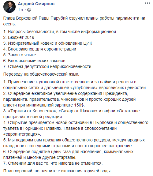 Шестым блоком на осень определили экономические законы. "И конечно, Конституционный суд. Напоминаю, что КС дал свое решение по двум проектам о неприкосновенности, и мы должны эти законопроекты рассмотреть и принять по ним решения", - сказал Парубий.