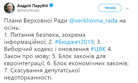 "Я хотел бы изложить целом планы на осень. Чтобы мы правильно могли формировать каждую пленарную неделю, важно видеть общий план и общие задачи, которые есть на осень", - сказал Парубий.
