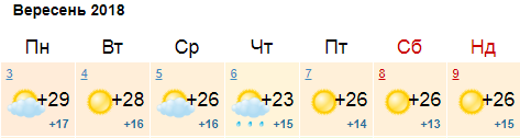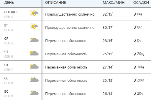 Еще один сайт Weather.com обещает  +28...+32 с понедельника по среду. В четверг +25 днем. В пятницу до +27. На выходных +25...+26. Всю неделю переменная облачность без осадков.