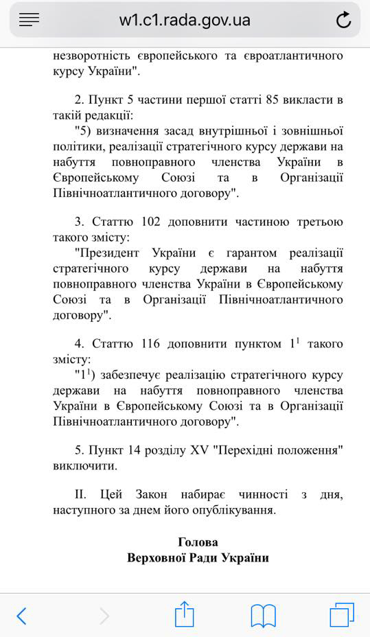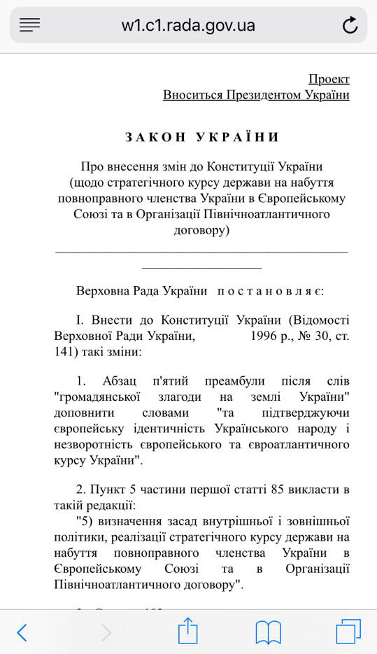 Также он появится в статьях 85, 102 и 116, которые определяют круг полномочий Верховной Рады, президента и Кабмина. В список их ответственности собираются добавить пункт об укреплении европейского и евроатлантического направления.